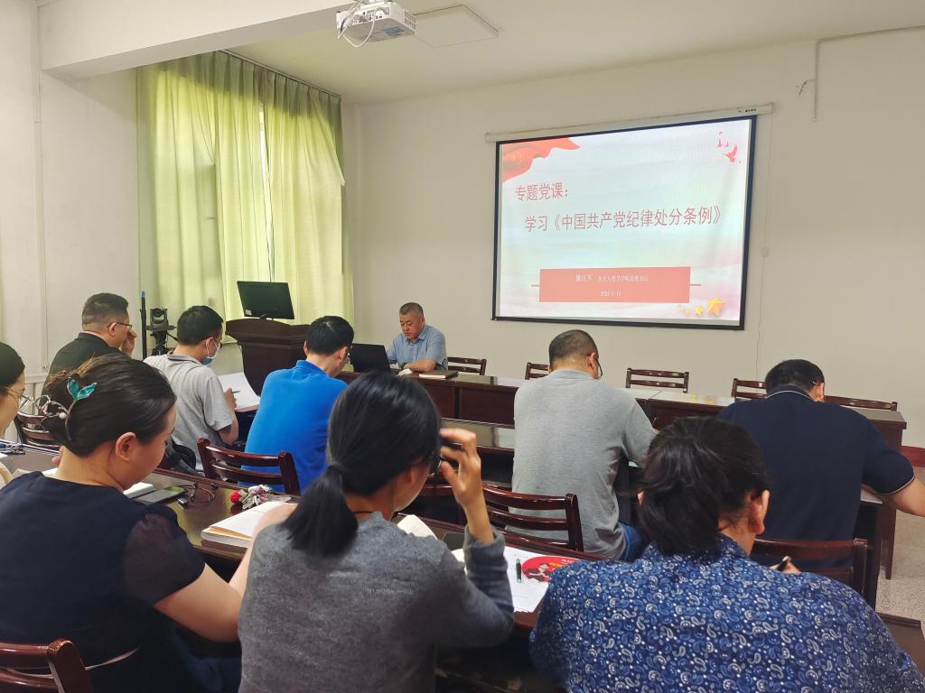 在202会议室,举行《中国共产党纪律处分条例》党纪学习教育专题党课,党课解读新修订的《中国共产党纪律处分条例》。党课由学院党委书记姚江军主讲,学院全体中国共产党党员,全体教工参加。