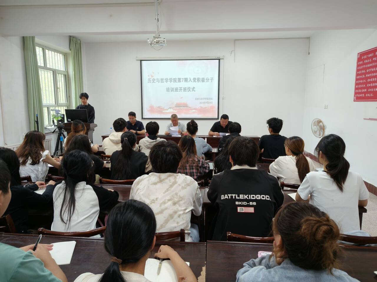 在史哲院204会议室举行了第七期入党积极分子培训班开班仪式。学院党委书记姚江军同志,学院党政办公主任张煜辉同志,历史系主任、教师党支部书记孙长龙同志以及30名入党积极分子参加了此次仪式。