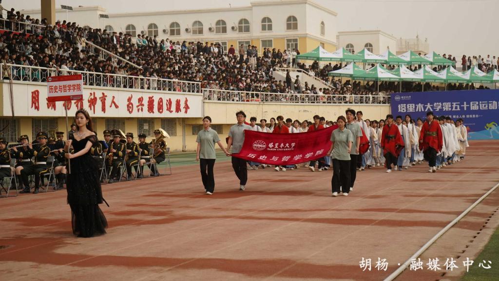 学院高度重视赛事筹备工作,多次组织方队训练与后勤演练。开幕式上,身着汉服的史哲方阵惊艳亮相,学生们手持折扇踏乐而行,在主席台前呈现同心圆造型。随着音乐转换,太极招式与扇子舞巧妙结合,刚柔并济的表演既彰显传统文化魅力,又迸发现代青春活力。由同心圆衍变的队形变换如行云流水,时而化作绽放的花朵,赢得全场热烈喝彩。