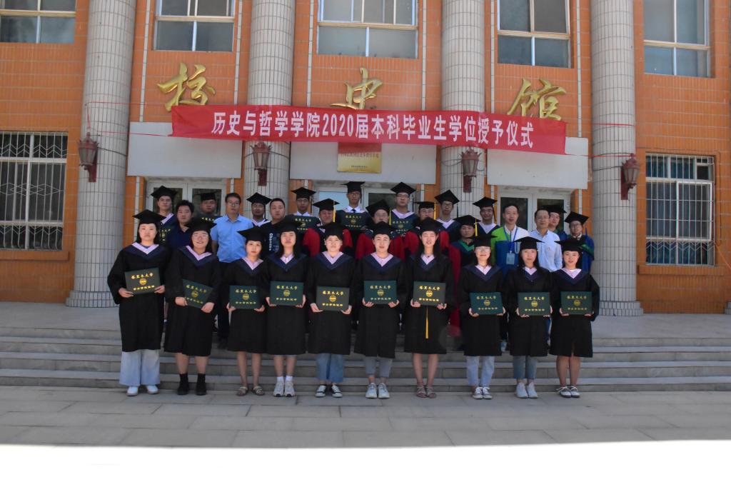 在校史馆前举行2020届毕业生学位授予仪式。参加学位授予的有2名西域屯垦史硕士研究生,36名历史学本科毕业生。仪式由学院党总支书记姚江军主持,院长万朝林代表学院致辞,副院长樊志强宣读“关于奖励学院优秀毕业生的决定”。