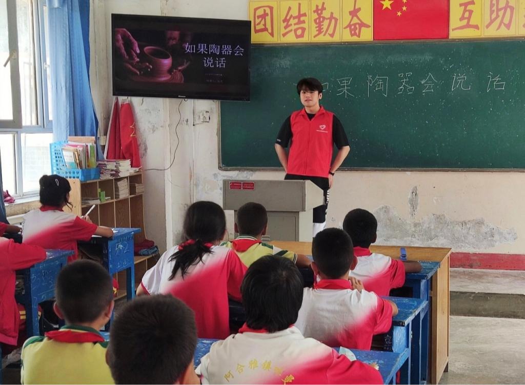 红旗招展出征去,奔赴吐曼献青春。上午十时,在张爱萍书记的号召下,实践团带着精心准备的教材和工具,走进了吐曼村小学的校园,立即受到了师生们的热烈欢迎,在简短的介绍过后,一场别开生面的陶器专题小课堂拉开了帷幕。讲解员化身历史文化的传播者,不仅深入浅出地为小朋友们讲解陶器的起源、发展以及在中国文化中的重要地位,还通过视频、实物展览等方式让孩子们踏入陶瓷世界,感悟古人的匠心独运。