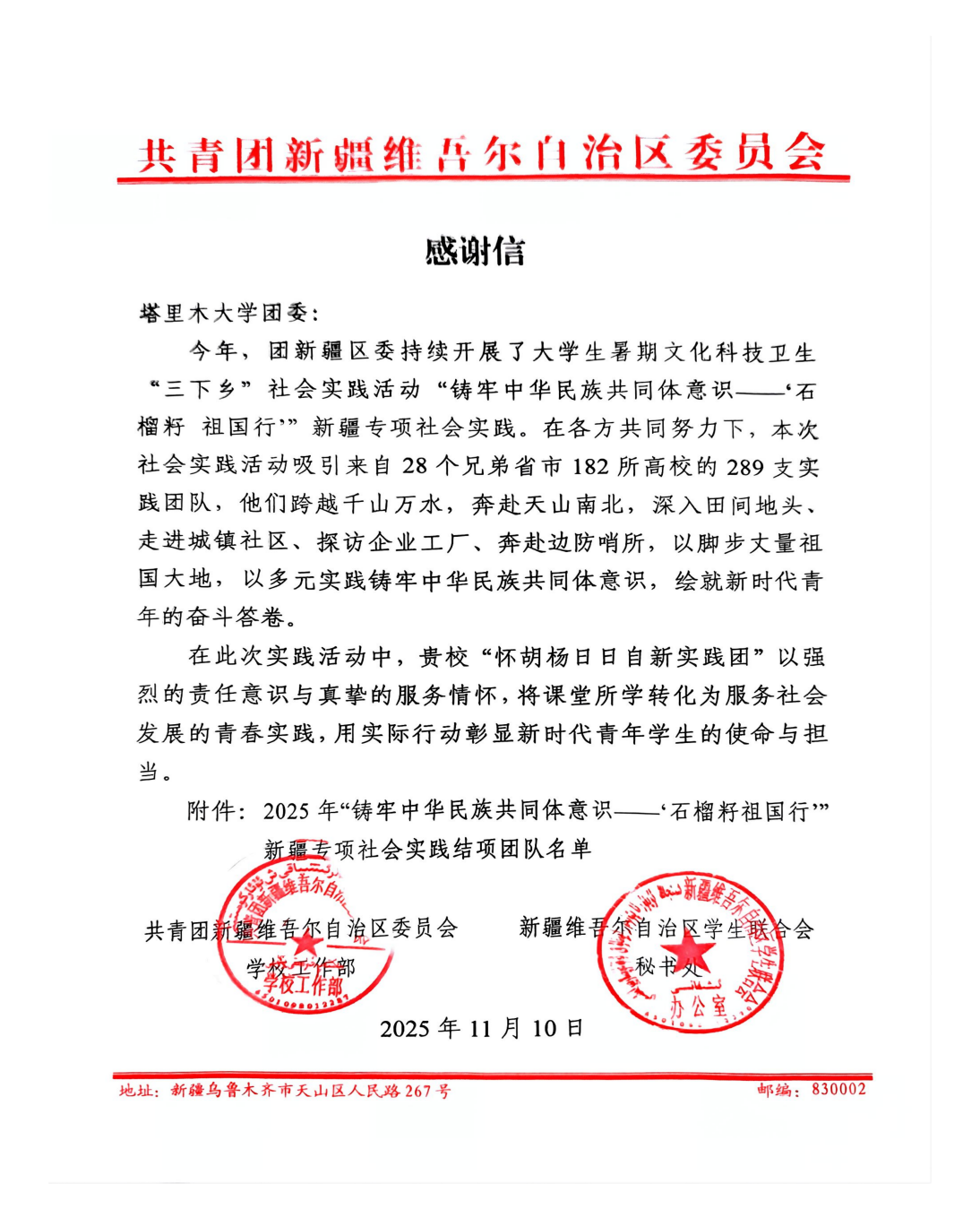 “怀胡杨日日自新”实践团队收到共青团新疆维吾尔自治区委员会的来信表扬,对其在2025年暑期赴南疆多地开展的青少年历史文化研学体验活动予以充分肯定。该实践活动属于“铸牢中华民族共同体意识·石榴籽祖国行”新疆专项社会实践,由共青团新疆维吾尔自治区委员会与新疆维吾尔自治区学生联合会共同组织。本次专项共吸引来自全国28个省市182所高校的289支团队参与。各团队深入天山南北的基层一线,通过实地调研、社区服务、文化体验等多种形式,积极践行民族团结,深化中华民族共同体意识教育。